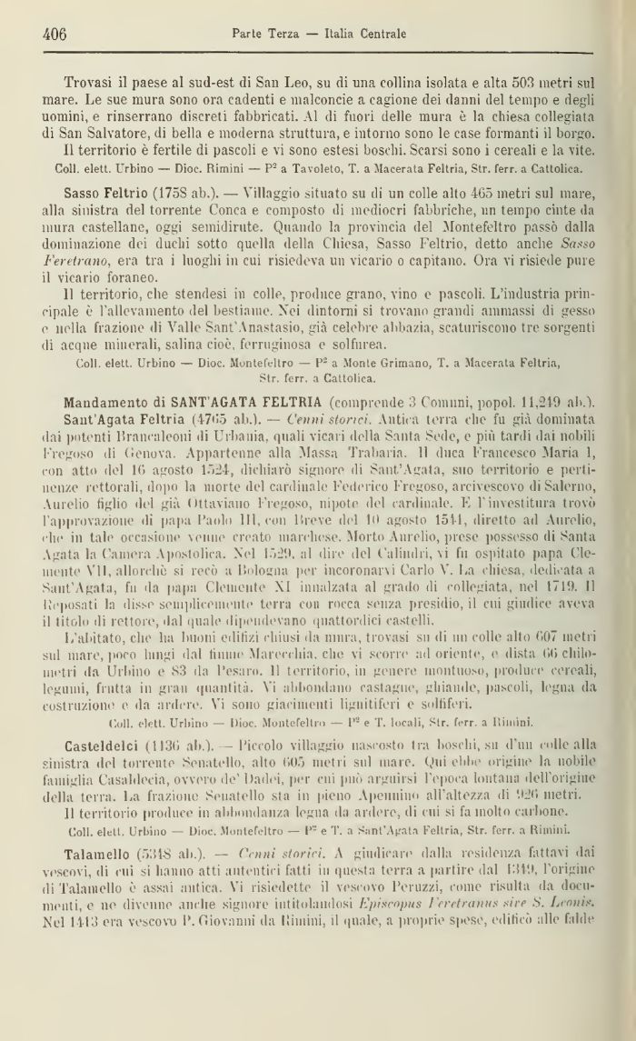 Talamello (531-8 ab.). — Cenni storici. A giudicare dalla residenza fattavi dai vescovi, ili cui si hanno atti autentici fatti in questa terra a partire dal 1319, l'origine di l'alaniello è assai antica. Vi risiedette il vescovo Peruzzi, come risulta da documenti, e ne divenne anche signore intitolandosi Fpiscopus l'crctranns sire S. Leoni». Nel 1113 era vescovi) P. Giovanni da Rimini, il quale, a proprie spese, edificò alle falde