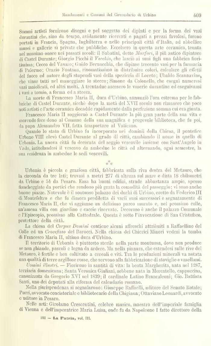 Sommi artisti fornirono disegni e pel soggetto dei dipinti e per la forma dei vasi dnrantini clte, sino da tempo, avidamente ricercati e pagati a prezzi favolosi, furono portati in Francia, Spagna, Inghilterra e nelle principali città d'Italia, ad abbellire musei e gallerie sì private che pubbliche. Eccelsero in questa arte ceramica, tenuta nel massimo onore nei passati secoli: il Sabatini, detto Mar fori, il più antico dipintore di Castel Durante; Giorgio Picchi il Vecchio, che lasciò ai suoi figli una fabbrica fioritissima; Cecco del Vasaro; Guido Bernacchia, che dipinse trecento vasi per la farmacia di Palermo; Orazio Fontana, rinomatissimo in distribuire colori, calcolare gli effetti del fuoco ed autore degli stupendi vasi della spezieria (li Loreto; Ubgldo Scannavino, che vinse tutti nel maneggiare lo stecco; Simone da Colonello, che eseguì numerosi vasi maiolicati, ed altri molti. A trenta due ascesero le vaserie durantine ed eseguivansi i vasi a tornio, a forma ed a stecca.