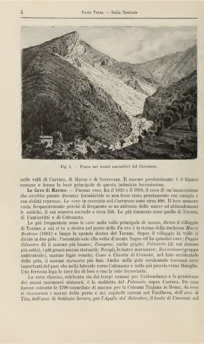 Le Cave di Marmo. — Furono esse, fra il 1893 e il 1894, il covo ili un'insili l ezione clie avrebbe potuto diventar formidabile se non fosse stata prontamente con energia e con abilità repressa. Le cave in esercizio nel Carrarese sono circa 400. Il loro numero varia frequentemente perchè di frequente se ne attivano delle nuove ed abbandonami le antiche, il cui numero ascende a circa 550. Le più rinomate sono quelle di 'l'orano, di F'antiscritti e di Colonnata.