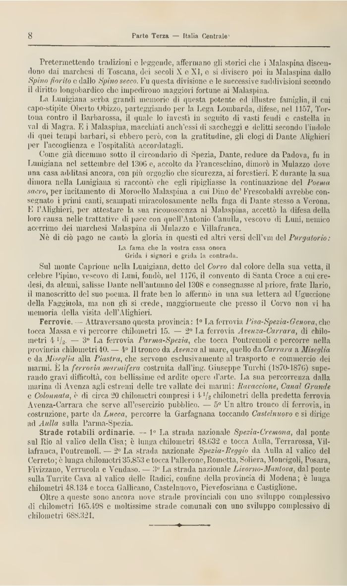 Come già dicemmo sotto il circondario di Spezia, Dante, reduce da Padova, fu in Lunigiana nel settembre del 1306 e, accolto da Franceschino, dimorò in Mulazzo dove una casa additasi ancora, con più orgoglio che sicurezza, ai forestieri. E durante la sua dimora nella Lunigiana si raccontò che egli ripigliasse la continuazione del Poema sacro, per incitamento dì Morocdlo Malaspina a cui Dino de' Frescobaldi avrebbe consegnato i primi canti, scampati miracolosamente nella fuga di Dante stesso a Verona. E l'Alighieri, por attestare la sua riconoscenza ai Malaspina, accettò la difesa della loro causa nelle trattative di pace con quell'Antonio Camilla, vescovo di Limi, nemico acerrimo dei marchesi Malaspina di Mnlazzo e Villafrunca.