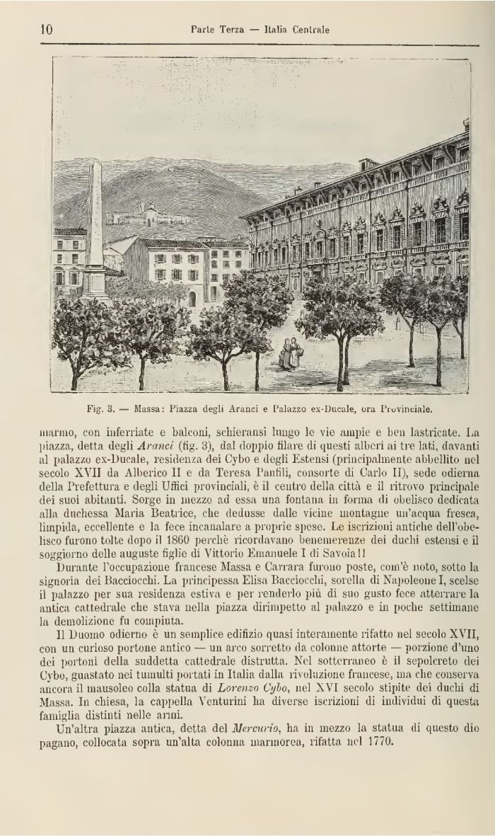 marino, con inferriate e balconi, sdiieransi lungo le vie ampie e ben lastricate. La piazza, detta degli Aranci (fig. 3), dal dóppia filare di questi alberi ai tre lati, davanti al palazzo ex-Ducale, residenza dei Cybo e degli Estensi (principalmente abbellito nel secolo XVII da Alberico li e da Teresa Panfili, consorte di Carlo II), sede odierna della Prefettura e degli Uffici provinciali, è il centro della città e il ritrovo principale dei suoi abitanti. Sorge in mezzo ad essa una fontana in forma di obelisco dedicata alla duchessa Maria Beatrice, che dedusse dalle vicine montagne un'acqua fresca, limpida, eccellente e la fece incanalare a proprie spese. Le iscrizioni antiche dell'obelisco furono tolte dopo il 1860 perchè ricordavano benemerenze dei duchi estensi e il soggiorno delle auguste figlie di Vittorio Emanuele I di Savoia ! !