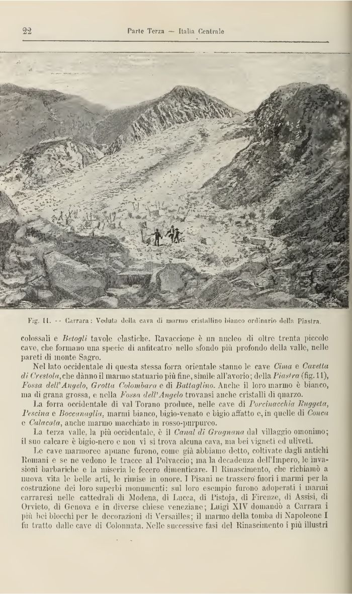 Nel lato occidentale di questa stessa forra orientale stanno le cave Cima e Cavettii di Crestola, che danno il marmo statuario più fine, simile all'avorio ; della Piastra (fig. 11), Fossa dell' Angelo, Grotta Colombara è di Battaglino. Anche il loro marino è bianco, ma di grana grossa, e nella Fossa dell'Angelo trovansi anche cristalli di quarzo.