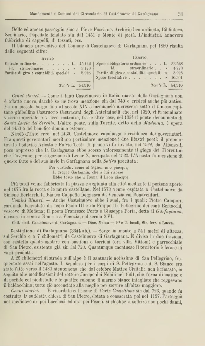 Bello ed ameno passeggio sino a Pieve Fosciana. Archivio ben ordinato, Biblioteca, Seminario, Ospedale fondato sin dal 1451 e Monto di pietà. L'industria annovera fabbriche di eappelli, di tessuti, ecc.