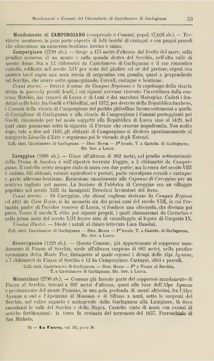 Uomini illustri. — Diede i natali al chiaro letterato Luca Bandini. Coli, elett. Castelnuovo di Garfagnana — Dioc. Massa — Pa locale, T. a Casleln. di Garfagnana, Str. ferr. a Lucca.