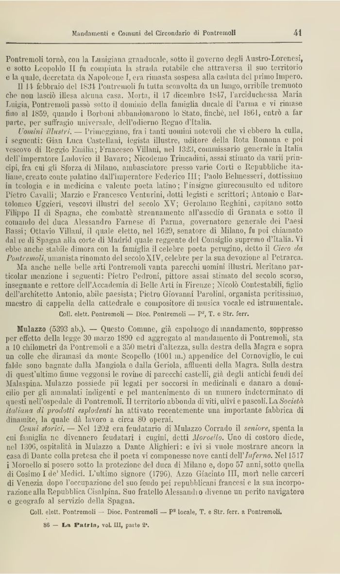 Mulazzo (5393 ab.). — Questo Comune, già capoluogo di inandamento, soppresso per effetto della legge 30 marzo 1890 ed aggregato al mandamento di Pontremoli, sta a 10 chilometri da Pontremoli e a 350 metri d'altezza, sulla destra della Magra e sopra un colle che diramasi da monte Scopello (1001 m.) appendice del Cornoviglio, le cui falde sono bagnate dalla Mangiola e dalla Geriola, affluenti della Magra. Sulla destra di quest'ultimo fiume veggonsi le rovine di parecchi castelli, già degli antichi feudi dei Malaspina. Mulazzo possiede pii legati per soccorsi in medicinali e danaro a domicilio per gli ammalati indigenti e pel mantenimento di un numero indeterminato di questi nell'ospedale di Pontremoli. Il territorio abbonda di viti, ulivi e pascoli. La Società italiana di prodotti esplodenti ha attivato recentemente una importante fabbrica di dinamite, la quale dà lavoro a circa 80 operai.