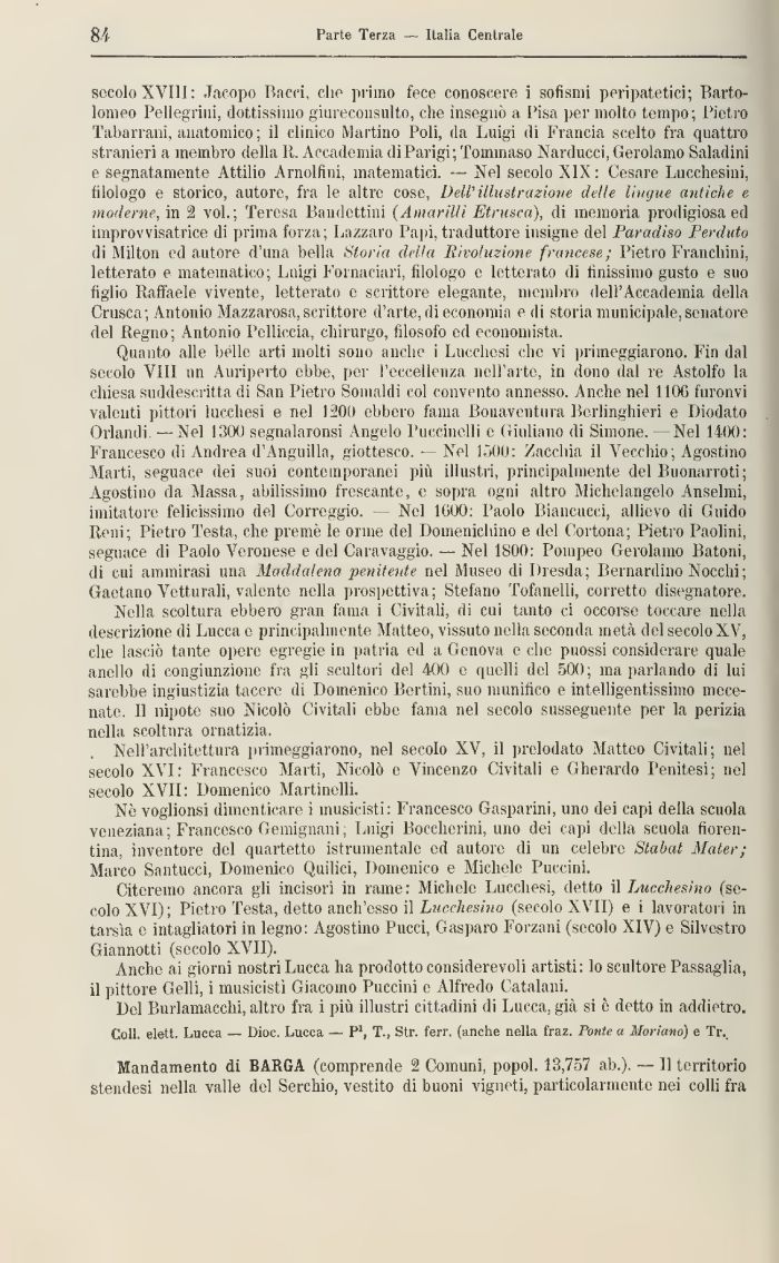 secolo XVIII: Jacopo Bacci, che primo fece conoscere i sofismi peripatetici; Bartolomeo Pellegrini, dottissimo giureconsulto, che insegnò a Pisa per molto tempo; Pietro Tabarrani, anatomico; il clinico Martino Poli, da Luigi di Francia scelto fra quattro stranieri a membro della lt. Accademia dì Parigi ; Tommaso Narducci, Gerolamo Saladini e segnatamente Attilio Arnollini, matematici. — Nel secolo XIX: Cesare Lucchesini, filologo e storico, autore, fra le altre cose, Dell'illustrazione delle lingue antiche e moderne, in 2 voi.; Teresa Bandettiui {Amarilli Etnisca), di memoria prodigiosa ed improvvisatrice di prima forza; Lazzaro Papi, traduttore insigne del Paradiso Perduto di Milton ed autore d'una bella Storia della Rivoluzione francese; Pietro Franchini, letterato e matematico; Luigi Fornaciari, filologo e letterato di finissimo gusto e suo tìglio Raffaele vivente, letterato e scrittore elegante, membro dell'Accademia della Crusca ; Antonio Mazzarosa, scrittore d'arte, di economia e di storia municipale, senatore del Regno; Antonio Pelliccia, chirurgo, filosofo ed economista.