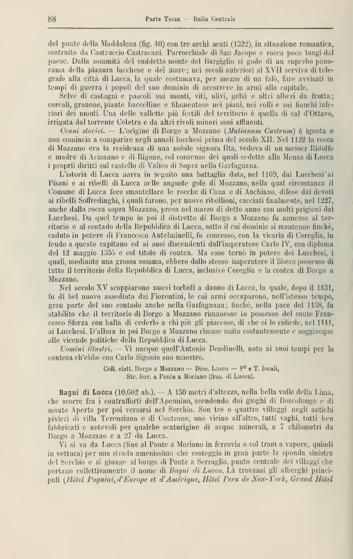 Bagni di Lucca (10,002 ab.). — A 150 metri d'altezza, nella bella valle della Lima, che scorre fra i contrafforti doll'Apennino, scendendo dai gioghi di Iioscolungo e di monte Aperto per poi versarsi nel Serchio. Son tre o quattro villaggi negli antichi pivieri di villa Terenziana e di Controne, uno vicino all'altro, tutti vaghi, tutti ben fabbricati e notevoli per qualche scaturigine di acque minerali, a 7 chilometri da Borgo a Mozzano e a 27 da Lucca.