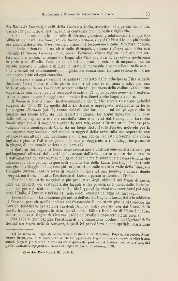 (1) Le acque dei Bagni di Lucca furono analizzate dal Moscheni, Dohati, Falloppio, Franceschi, Bechi, ecc., oltre molti stranieri ; la bibliografia dei Bagni di Lucca comprende oltre trenta autori. L'opera più recente intorno ad essi è quella del prof. cav. A. Carisa, medico direttore, dal gitolo : Indicatore topografico e medico ai Bagni di Imcca, 31 edizione, 1876.