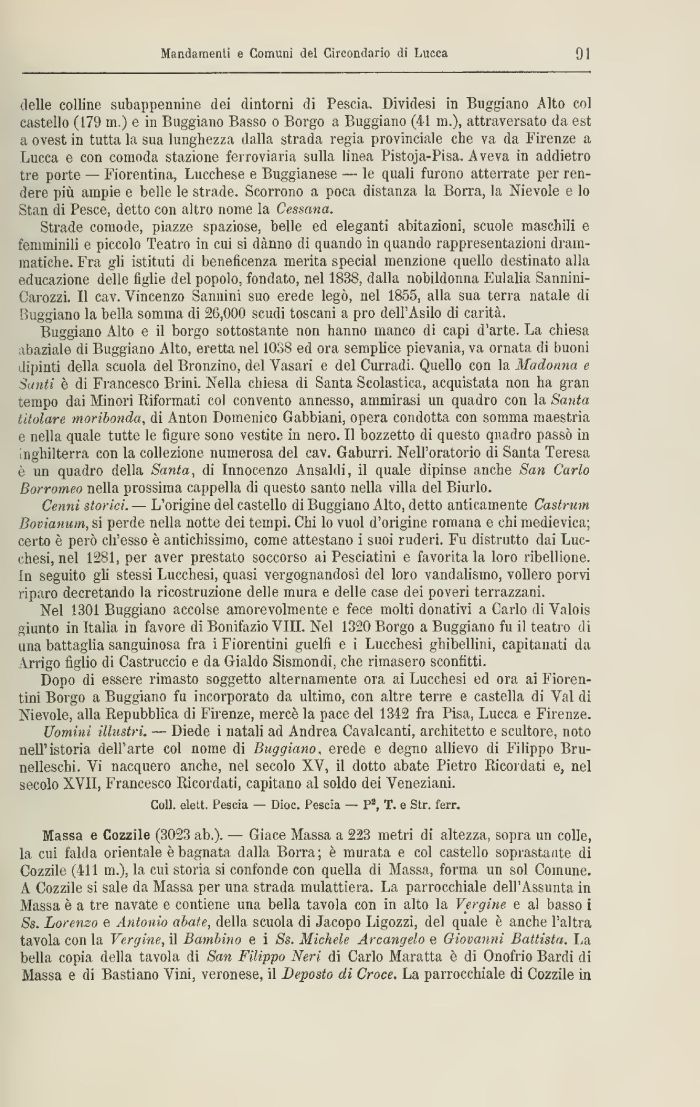 Massa e Cozzile (3023 ab.). — Giace Massa a 223 metri di altezza, sopra un colle, la cui falda orientale è bagnata dalla Borra; è murata e col castello soprastante di Cozzile (411 tu.), la cui storia si confonde con quella di Massa, forma un sol Comune. A Cozzile si sale da Massa per una strada mulattiera. La parrocchiale dell'Assunta in Massa è a tre navate e contiene una bella tavola con in alto la Vergine e al basso i Ss. Lorenzo e Antonio abate, della scuola di Jacopo Ligozzi, del quale è anche l'altra tavola con la Vergine, il Bambino e i Ss. Michele Arcangelo e Giovarmi Battista. La bella copia della tavola di San Filippo Neri di Carlo Maratta è di Onofrio Bardi di Massa e di Bastiano Vini, veronese, il Deposto di Croce. La parrocchiale di Cozzile in