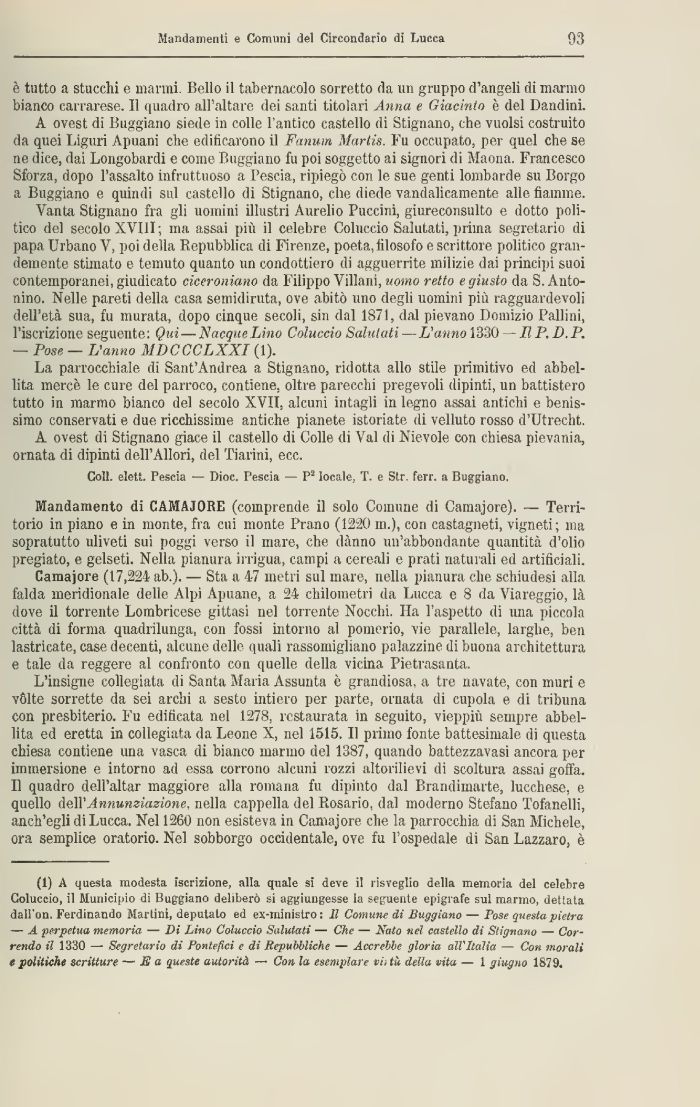 (1) A questa modesta iscrizione, alla quale si deve il risveglio della memoria del celebre Coluccio, il Municipio di Buggiano deliberò si aggiungesse la seguente epigrafe sui marmo, dettata dall'on. Ferdinando Martini, deputato ed ex-ministro : lì Comune di Buggiano — Pose questa pietra -— A perpetua memoria — Di Lino Coluccio Salutati — Che — Nato nel castello di Stignano — Correndo il 1330 — Segretario dì Pontefici e di Repubbliche — Accrebbe gloria all'Italia — Con inorali e politiche scritture — E a queste autorità —- Con la esemplare vii tu della vita — 1 giugno 1870.