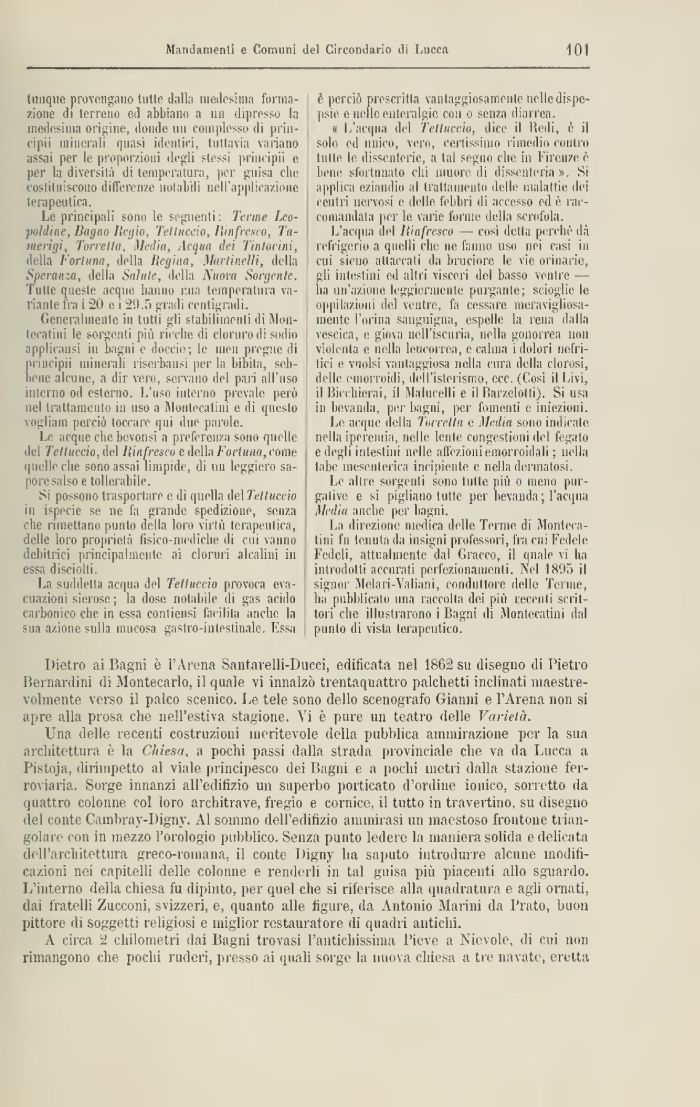 Una delle recenti costruzioni meritevole della pubblica ammirazione per la sua architettura è la Chiesa, a pochi passi dalla strada provinciale che va da Lucca a Pistoja, dirimpetto al viale principesco dei Bagni e a pochi metri dalla stazione ferroviaria. Sorge innanzi alFedifizio un superbo porticato d'ordine ionico, sorretto da quattro colonne col loro architrave, fregio e cornice, il tutto in travertino, su disegno (lei conte Cambray-Digny. Al sommo delPedifizio ammirasi un maestoso frontone triangolare con in mezzo l'orologio pubblico. Senza punto ledere la maniera solida e delicata dell'architettura greco-romana, il conte J)igny lia saputo introdurre alcune modificazioni nei capitelli delle colonne e renderli in tal guisa più piacenti allo sguardo. L'interno della chiesa fu dipinto, per quel che si riferisce alla quadratura e agli ornati, dai fratelli Zucconi, svizzeri, e, quanto alle figure, da Antonio Marini da Prato, buon pittore di soggetti religiosi e miglior restauratore di quadri antichi.
