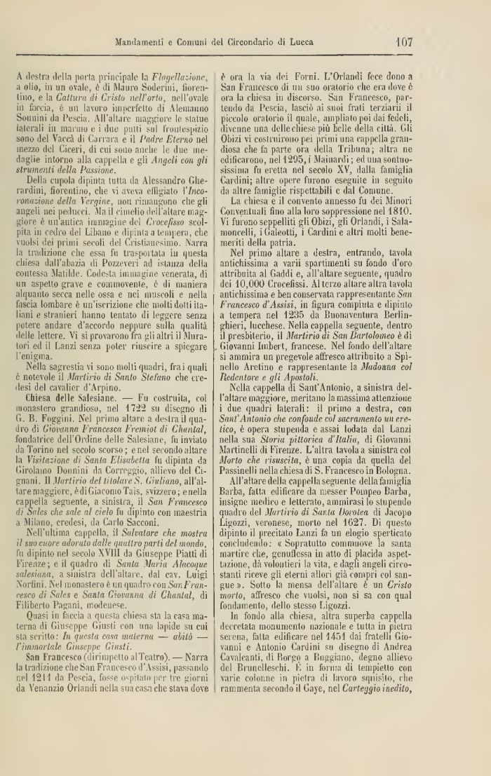 è ora la via dei Forni. L'Orlandi fece dono a San Francesco di un suo oratorio che era dove 6 ora la chiesa in discorso. San Francesco, partendo da Pescia, lasciò ai suoi frati terziarii il piccolo oratorio il quale, ampliato poi dai fedeli, divenne una delle chiese più belle della città. Gli Obizi vi costruirono pei primi una cappella grandiosa che fa parte ora della Tribuna; altra ne edificarono, nel 1295, i Mai nardi ; ed una sontuosissima fu eretta nel secolo XV, dalla famiglia Cardini; altre opere furono eseguite in seguito da altre famiglie rispettabili e dal Comune.