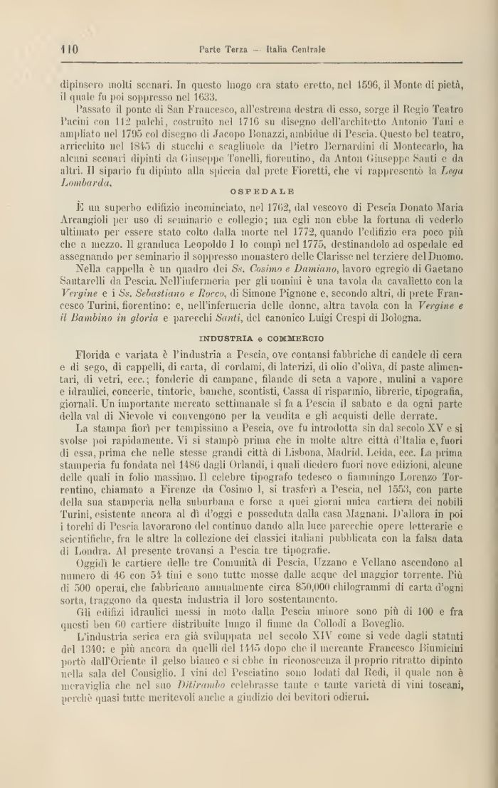La stampa fiorì per tempissimo a Pescia, ove fu introdotta sin dal secolo XV e si svolse poi rapidamente. Vi si stampò prima che in molte altre, città d'Italia e, fuori di essa, prima che nelle stesse grandi città di Lisbona, Madrid. Leida, ecc. La prima stamperia fu fondata nel I486 dagli Orlandi, i quali diedero fuori nove edizioni, alcune delle quali in folio massimo. Il celebre tipografo tedesco o fiammingo Lorenzo Tor-rentino, chiamato a Firenze da Cosimo 1, si trasferì a Pescia, nel 1553, con parte della sua stamperia nella suburbana e forse a quéi giorni unica cartiera dei nobili T'urini, esistente ancora al dì d'oggi e posseduta dalla casa Magnani. D'allora in poi i torchi di Poscia lavorarono elei continuo dando alla luce parecchie opere letterarie e scientifiche, fra le altre la collezione dei classici italiani pubblicata con la falsa data di Londra. Al presente trovali»': a Pescia tre tipografie.