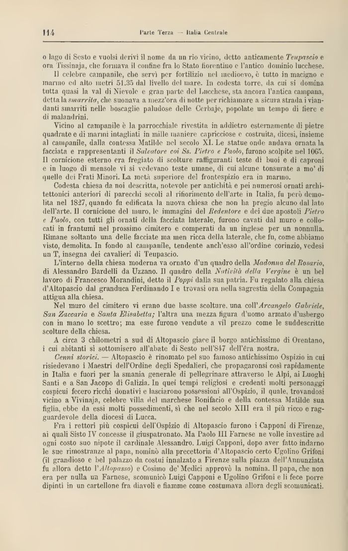 Cenni storici. — Altopascio è rinomato pel suo famoso antichissimo Ospizio in cui risiedevano i Maestri dell'Ordine degli Spedalicri, che propagaronsi così rapidamente in Italia e fuori per la smania generale di pellegrinare attraverso le Alpi, ai Luoghi Santi e a San Jacopo di Galizia. In quei tempi religiosi e credenti molti personaggi cospicui fecero ricchi donativi e lasciarono possessioni all'Ospizio, il quale, trovandosi vicino aVivinaja, celebre villa del marchese Bonifacio e della contessa Matilde sua figlia, ebbe da essi molti possedimenti, sì elio nel secolo XIII era il più ricco e ragguardevole della diocesi di Lucca.