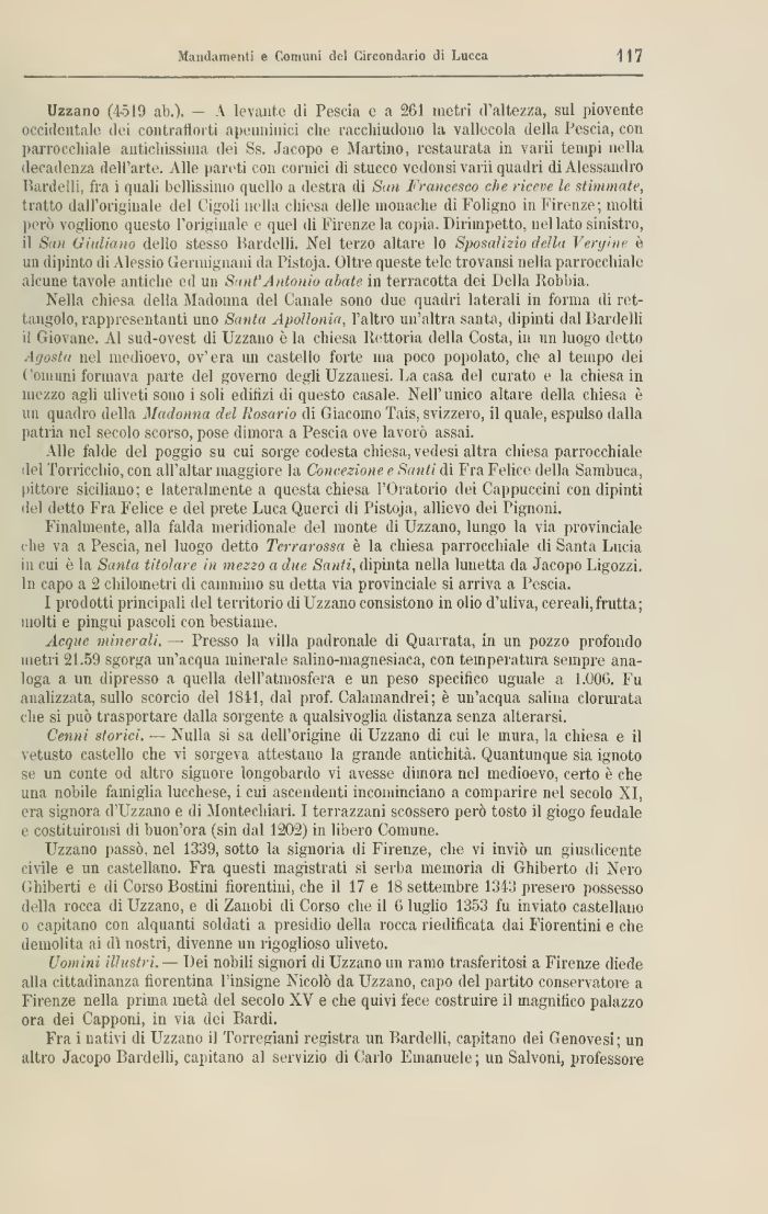 Uzzano (4519 ab.). - \ levante ili Pescia e a 261 metri d'altezza, sul piovente occidentale dei contrafforti apeuniiiici che racchiudono la vallocola della Pescia, con Iiarrocchiale antichissima ilei Ss. Jacopo e Martino, restaurata in varii tempi nella decadenza dell'arte. Alle pareti con cornici dì stucco vedonsi varii quadri di Alessandro Bardelli. fra i quali bellissimo quello a destra di Stm Francesco che riceve le stimmate, tratto dall'originale del Cigoli nella chiesa delle monache di Foligno in Firenze; molti però vogliono questo l'originale e quel di Firenze la copia. Dirimpetto, nel lato sinistro, il San Giuliano dello stesso Bardelli. Nel terzo altare lo Sposalizio della Vert/ine è un dipinto di Alessio Germignani da Pistoja. Oltre queste tele trovansi nella parrocchiale alcune tavole antiche ed un Sant'Antonio abate in terracotta dei Della Robbia.