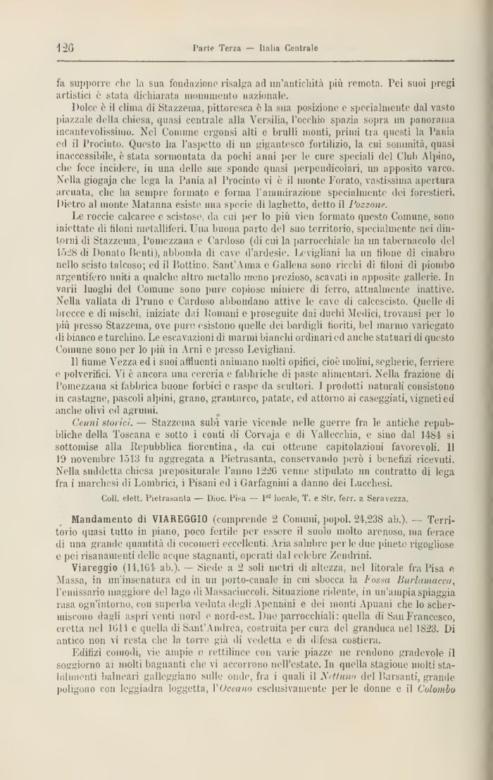Viareggio (14,101- ab.). — Siede a 2 soli metri di altezza, nel litorale fra Pisa e Massa, in un'insenatura ed in un porto-canale in cui sbocca la l'ossa Hurlumacca, l'emissario maggiore del lago di Massaciuccoli. Situazione ridente, in un'ampia spiaggia rasa ognintorno, con superba veduta degli A pennini e dei monti Apuani che lo schermiscono dagli aspri venti nord e nord-est. Due parrocchiali: quella di San Francesco, eretta nel 1011 e quella di Sant'Andrea, costruita per cura del granduca nel 1823. Di antico non vi resta clic la torre già di vedetta e di difesa costiera.