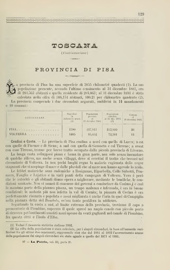 YV A provincia di Pisa ha una superficie ili 3035 chilometri quadrati (1). La sua I A popolazione presente, secondo l'ultimo censimento al 31 dicembre ISSI, era di 983,563 abitanti e quella residente di 281-,063; al 31 dicembre 1893 è stata calcolata nella cifra di 306,151 abitanti, 100.21 per chilometro quadrato (2). La provincia comprende i due circondari seguenti, suddivisi in 14 mandamenti e 40 comuni: