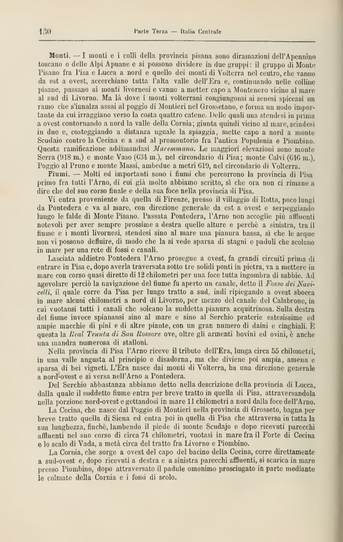Lasciata addietro Pontedera l'Arno prosegue a ovest, fa grandi circuiti prima di entrare in Pisa e, dopo averla traversata sotto tre solidi ponti in pietra, va a mettere in mare con corso quasi diretto di 12 chilometri per una foce tutta ingombra di sabbie. Ad agevolare perciò la navigazione del fiume fu aperto un canale, detto il Fosso dei Navicelli, il quale corre da Pisa per lungo tratto a sud, indi ripiegando a ovest sbocca in mare alcuni chilometri a nord di Livorno, per mezzo del canale del Calabrone, in cui vuotansi tutti i canali che solcano la suddetta pianura acquitrinosa. Sulla destra del fiume invece spianansi sino al mare e sino al Serchio praterie estesissime ed ampie macchie di pini e di altre piante, con un gran numero di daini e cinghiali. È questa la ficai Tenuta di San Rossore ove, oltre gli armenti bovini ed ovini, è anche una mandra numerosa di stalloni.
