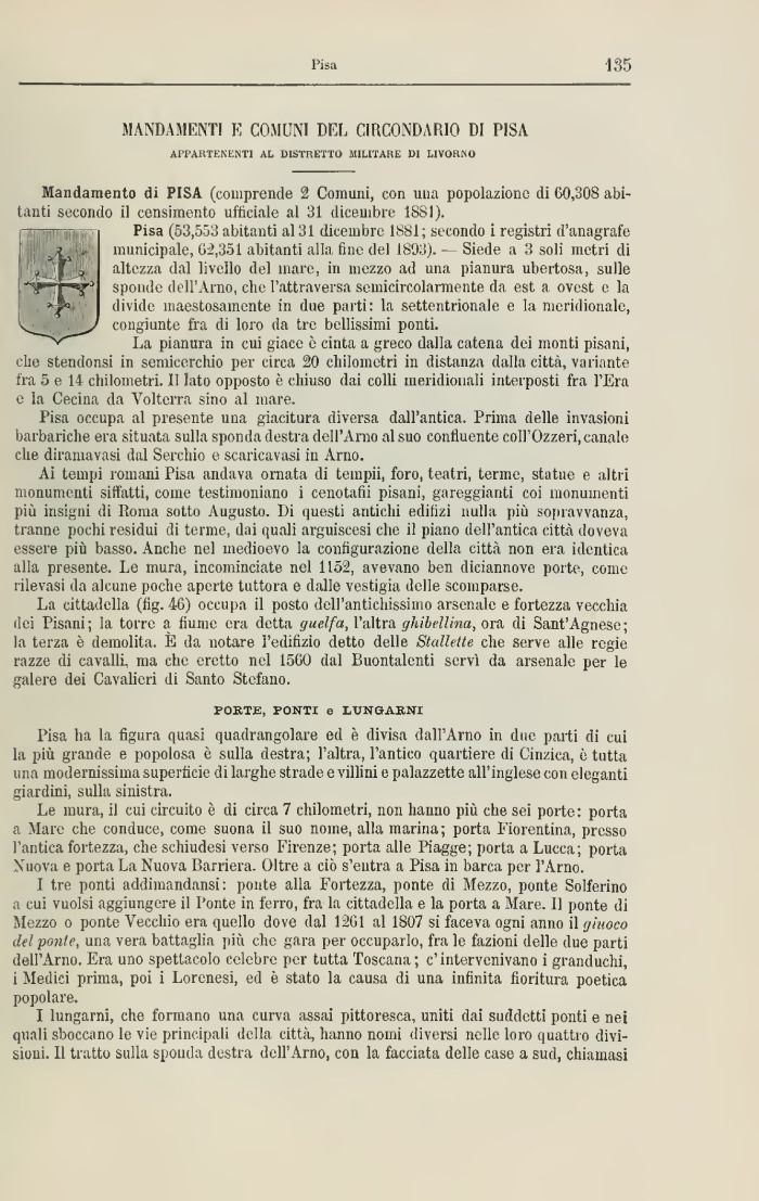 Mandamento di PISA (comprende 2 Comuni, con mia popolazione di 60,308 abitanti secondo il censimento ufficiale al 31 dicembre ISSI). iWlWIIHIlllllnr Pisa (53,553 abitanti al 31 dicembre 1881; secondo i registri d'anagrafe municipale, 62,351 abitanti alla tino del 1893]. .— Siede a 3 soli metri di altezza dal livello del mare, in mezzo ad una pianura ubertosa, sulle sponde dell'Arno, che l'attraversa semicircolarmente da est a ovest e la divide maestosamente in due parti: la settentrionale e la meridionale, congiunte fra di loro da tre bellissimi ponti.