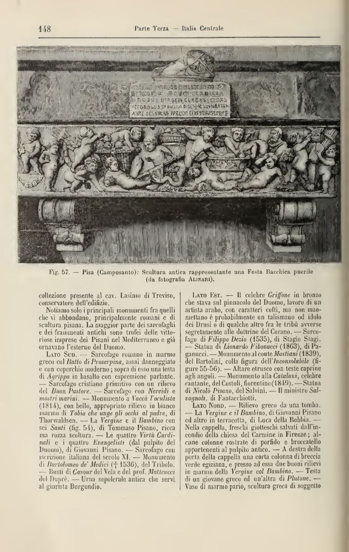 Lato Sud. — Sarcofago romano in marmo greco col Iìatlo di Proserpina, assai danneggiato e con coperchio moderno ; sopra di esso una testa di Agrippa in basalto con espressione parlante. — Sarcofago cristiano primitivo con un rilievo del Buon Pastore. — Sarcofago con Nereidi e mostri marini. —Monumento a Toccò l'oculista ( 1814), con bello, approprialo rilievo iu bianco marmo di Tobia che unge gli occhi al padre, di Tliorwaldsen. — La Vergine e il Bambino con sei Santi (fig. 54), di Tommaso Pisano, ricca ma rozza scollura. — Le quattro Virtù Cardinali e i quattro Evangelisti (dal pulpito del Duomo), di Giovanni Pisano. -— Sarcofago con iscrizione italiana del secolo XI. — Monumento di Bartolomeo de' Medici (-f 1536), del Tribolo. -— Busti di Cavour del Vela e del prof. Matteucci del Duprè. — Urna sepolcrale antica che servì al giurista Burgundi©.