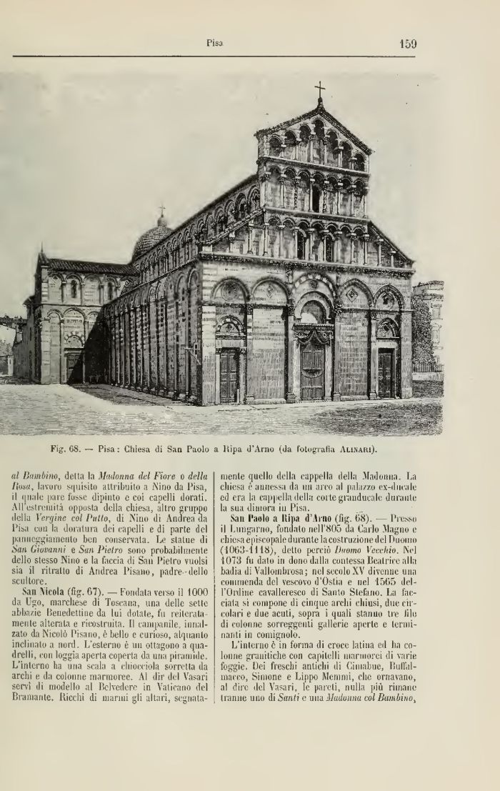 San Paolo a Hipa d'Arno (fig. 68). — Presso il Lungarno, fondato nell'805 da Carlo Magno e chiesa episcopale durante la costruzione del Duomo (4063-1118), detto perciò Duomo Vecchio. Noi 1073 fu dato in dono dalla contessa Beatrice alla badia di Valloinbrosa; nel secolo XV divenne una commenda del vescovo d'Ostia e nel 1565 dell'Ordine cavalleresco di Santo Stefano. La facciata si compone di cinque archi chiusi, due circolari e due acuti, sopra i quali stanno tre file di colonne sorreggenti gallerie aperte e terminanti in comignolo.