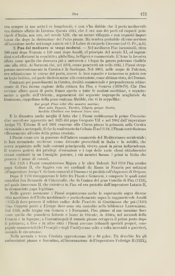 K lo dimostra anche meglio il fatto che i Pisani codificarono le prime Consuetudini mardhme. approvate nel 1025 dal papa Gregorio VII e nel 1082 dall' imperatore Arrigo VI. Urbano li liei 1091 concesse alla Chiesa pisana la primazia sulla Corsica elevandola a metropoli; il che fu confermato da Gelasio II nel 1118.1 Pisani contribuirono efficacemente all'esito della prima crociata.