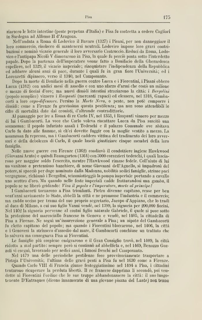 Le famiglie più cospicue emigrarono e il Gran Consiglio trovò, nel 1409, la città ridotta a inai partito: sempre però si continuò ad abbellirla e, nel 1409, Benozzo Goz-zoli vi eseguì, lavorando per sedici anni, i famosi freschi nel Camposanto.