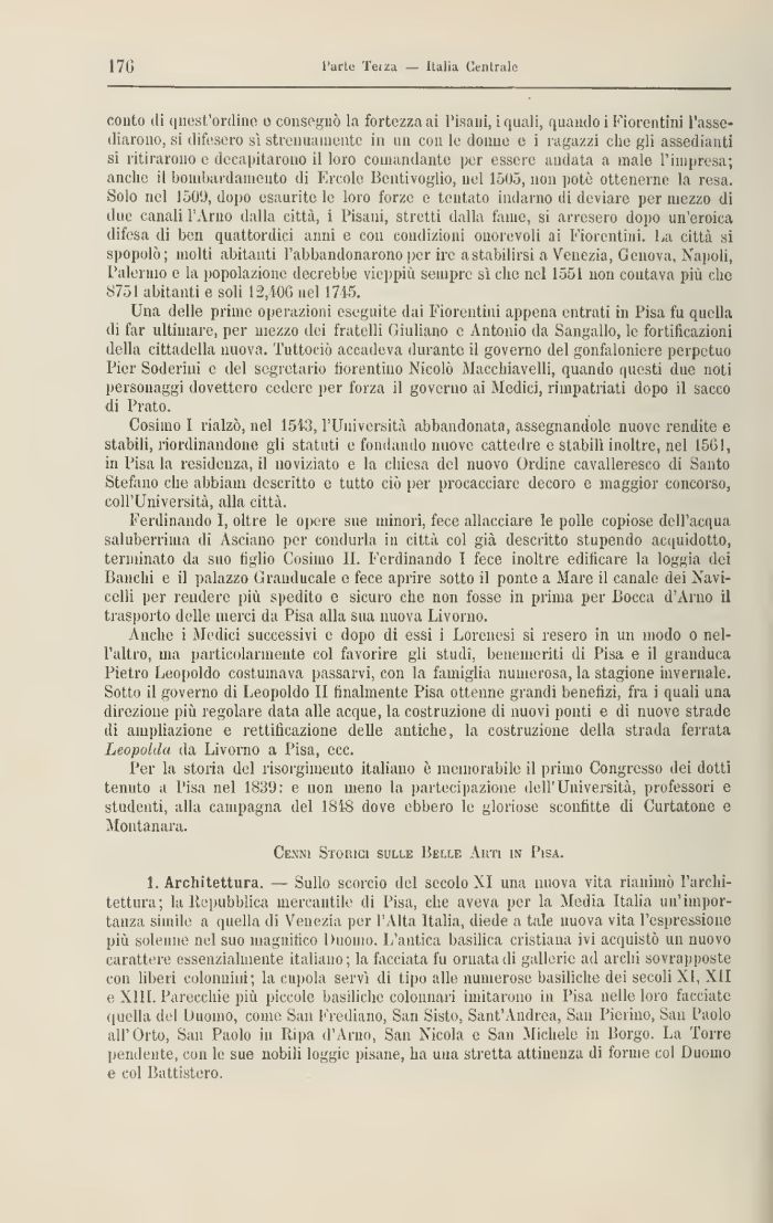 conto di quest'ordine o consegnò la fortezza ai risani, i quali, quando i Fiorentini l'assediarono, si difesero sì strenuamente in un con le donne e i ragazzi che gli assedianti si ritirarono e decapitarono il loro comandante per essere andata a male l'impresa; anche il bombardamento di Ercole Bentivoglio, nel 1505, non potè ottenerne la resa. Solo nel 150'J, dopo esaurite le loro forze e tentato indarno di deviare per mezzo di due canali 1 Arno dulia città, i Pisani, stretti dalla faine, si arresero dopo un'eroica difesa di ben quattordici anni e con condizioni onorevoli ai Fiorentini. La città si spopolò; molti abitanti l'abbandonarono per ire astabilirsi a Venezia, Genova, Napoli, L'alenilo e la popolazione decrebbe vieppiù sempre sì che nel 1551 non contava più che S751 abitanti a soli 13,100 nel 1715.