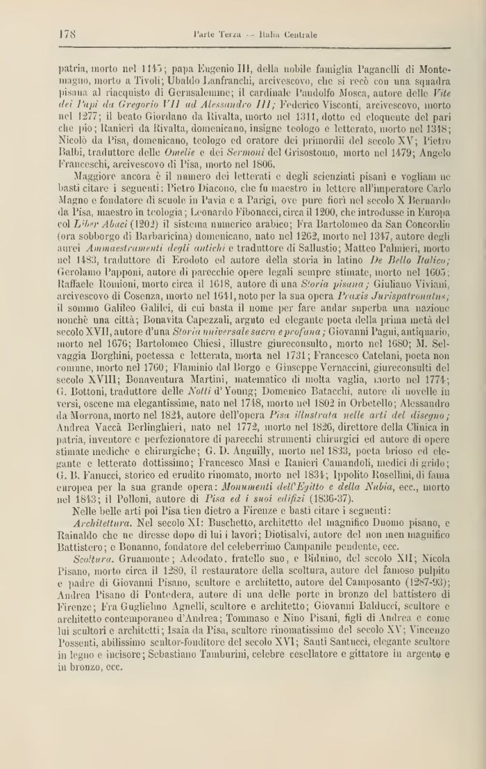 patria, morto nel Ilio; papa Eugenio 111. della nobile famiglia Paganelli di Monte-magno, morto a Tivoli; Ubaldo Lanfranchi, arcivescovo, clic si recò con una squadra pisana al riacquisto di Gerusalemme; il cardinale Panilolfo Mosca, autore dello Vite del ]'11 pi da Gregorio l'I] ad Alessandro IH; Federico Visconti, arcivescovo, morto nel 1277; il beato Giordano ila llivalta, morto nel Hill, dotto ed eloquente del pari elle pio; Ranieri da Itivalta, domenicano, insigne teologo e letterato, morto nel 1318; Nicolò da Pisa, domenicano, teologo ed oratore dei piiinordii del secolo XV: Pietro Balbi, traduttore delle Omelie e dei Sermoni del Crisostomo, morto nel 14-79; Angelo Franceschi, arcivescovo di Pisa, morto nel 180G.