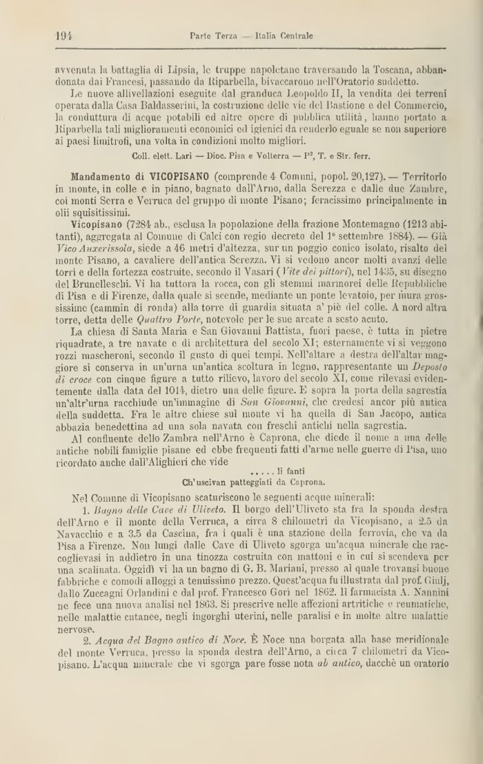 1. Bagno delle Cave di Uliveto. Il borgo dell'Uliveto sta fra la sponda destra dell'Arno e il monte della Verruca, a circa 8 chilometri da Vicopisano, a 2.5 da Navaccliio e a 3.5 da Cascina, fra i quali è mia stazione della ferrovia, che va da Pisa a Firenze. Non lungi dalle Cave di Uliveto sgorga un'acqua minerale che rac-coglievasi in addietro in una tinozza costruita con mattoni e in cui si scendeva per mia scalinata. Oggidì vi ha un bagno di G. B. Mariani, presso al quale trovansi buone fabbriche e comodi alloggi a tenuissimo prezzo. Quest'acqua fu illustrata dal prof. Giulj, dallo Zuccagni Orlandini e dal prof. Francesco Gori nel 1862. Il farmacista A. Nannini ne fece una nuova analisi nel 1863. Si prescrive nelle affezioni artritiche e reumatiche, nelle malattie cutanee, negli ingorgili uterini, nelle paralisi e in molte altre malattie nervose.