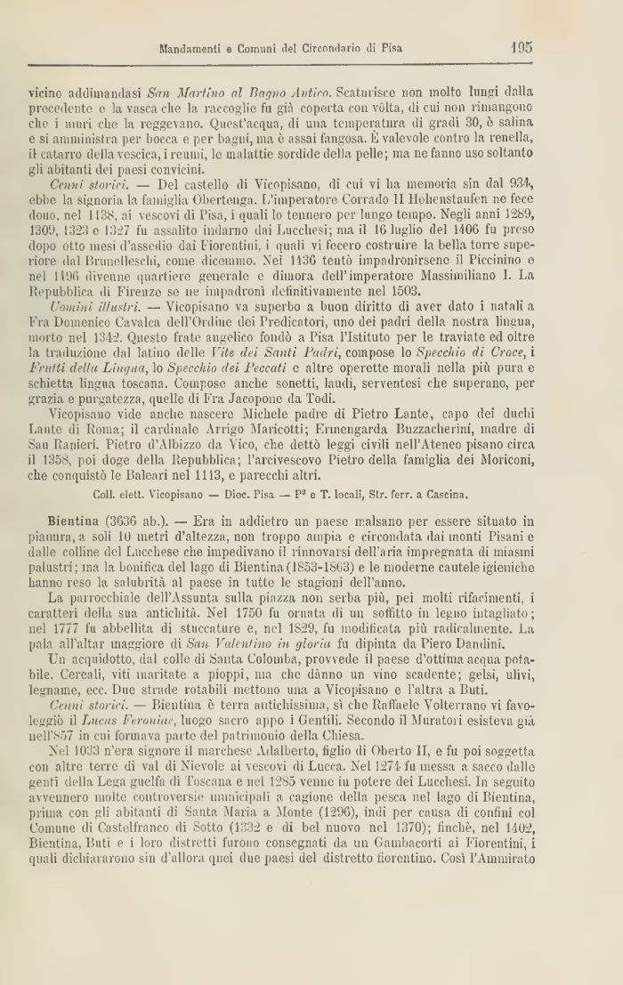 Hientiiia (3636 ab.). — Era in addietro un paese malsano per essere situato in pianura, a soli 10 metri d'altezza, non troppo ampia e circondata (lai monti Pisani e dalle colline del Lucchese che impedivano il rinnovarsi dell'aria impregnata di miasmi palustri; ina la bonifica del lago di Bientina(1853-1863) e le moderne cautele igieniche hanno reso la salubrità al paese in tutte le stagioni dell'anno.