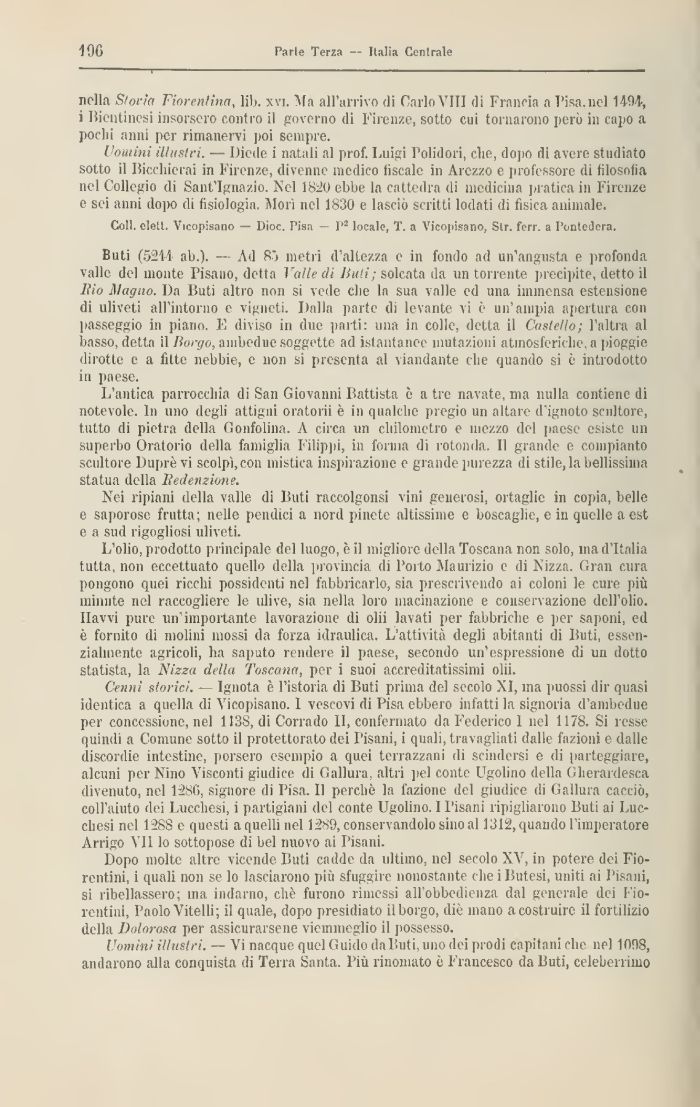 Buti (5214 ab.). — Ad 85 metri d'altezza e in fondo ad un'angusta e profonda valle del monte Pisano, detta Valle di Unii; solcata da un torrente precipite, detto il Rio Magno. I)a liuti altro non si vede che hi sua valle ed una immensa estensione di uliveti all'intorno e vigneti. Dalla parte di levante vi è un ampia apertura con passeggio in piano. 15 diviso in due parti: una in colle, detta il Castello; l'altra al basso, detta il Borgo, ambedue soggette ad istantanee mutazioni atmosferiche, a pioggie dirotte e a fitte nebbie, e non si presenta al viandante che quando si è introdotto in paese.