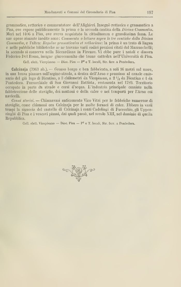 Calcinaja (3903 ab.). — Grosso borgo e ben fabbricato, a soli Iti metri sul mare, in una bassa pianura sull'argino-strada, a destra dell'Arno e prossimo al canale emissario del già lago di Bientiua, a 3 chilometri da Vieopisano, a 2 I/2 da Bientiua e 4 da Pontedera. Parrocchiale di San Giovanni Battista, restaurata nel 17S9. Territorio occupato in parte ti» strade e corsi d'acqua. L'industria principale consiste nella fabbricazione delle stoviglie, dei mattoni e della calce e liei trasporti per l'Arno coi navicelli.