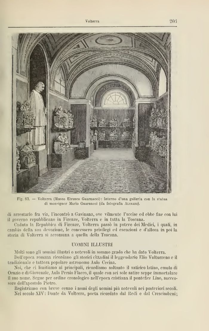 Fig. S3. — Volterra (Museo Etrusco Guarnacci); Interno d'una galleria con la sfatua di monsignor .Mario Guarnacci (da fotografia Alinari).