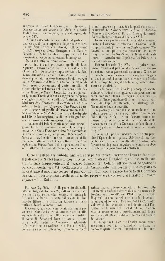 Fortezza (fìg. 88). — Nella parte più alta della città nel luogo detto Castello, dall'antica rocca ivi esistita linda remotissimi tempi, si innalzala fortezza di Volterra. E slata fabbricala in due epoche differenti e divisa in Cassero o rocca antica e Mastio o rocca nuova.