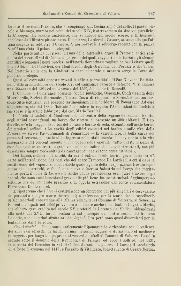 Dei lagoni, soffioni e fumacchi, da cui si estrae l'acido borico, già abbastanza s'è detto nell'introduzione, del pari che del conte Francesco De Larderei a cui si deve la sostituzione del vapore al combustibile quale agente della evaporazione, trovato ingegnoso che lo arricchì, e fondò una nuova e lucrosa industria nel borgo che inerita-niente porta il nome di Larderdlo anche per la provvidenza esemplare a favore degli operai, che sono tutti benestanti grazie alle più bene intese istituzioni. Aggiungeremo soltanto che del minerale prezioso si fa oggi la estrazione dal conte commendatore Florestano De Larderei.