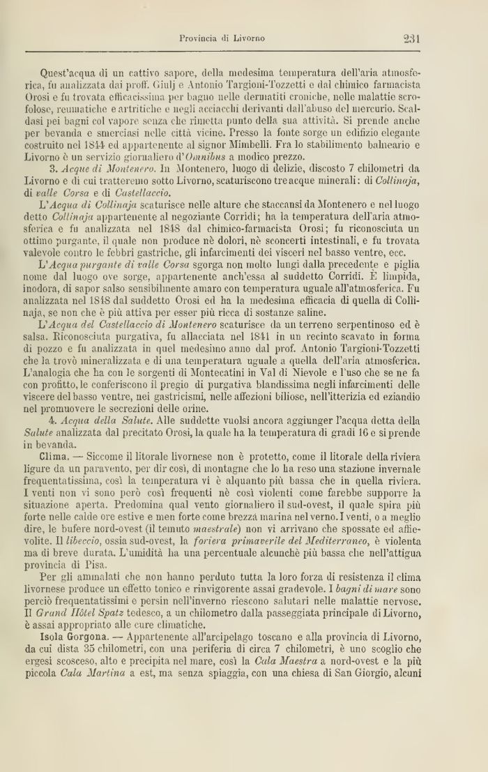 3. Acque di Montenero. In Montenero, luogo di delizie, discosto 7 chilometri da Livorno e di cui tratteremo sotto Livorno, scaturiscono tre acque minerali : di Collinaja, di valle Corsa e di Castellacelo,