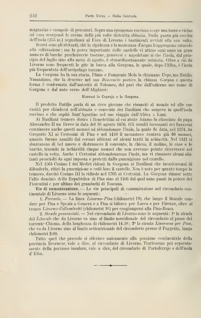 La Gorgona ha la sua storia. Plinio e Pomponio .Mela la chiamano Vrgo, ma Buffilo Nuniaziano, che la descrive nel suo Itinerario poetico, la chiama Gorgon e questa forma è confermata dall'autorità di Tolomeo, del pari che dall'odierno suo nome di Gorgona e dal noto verso dell'Alighieri: