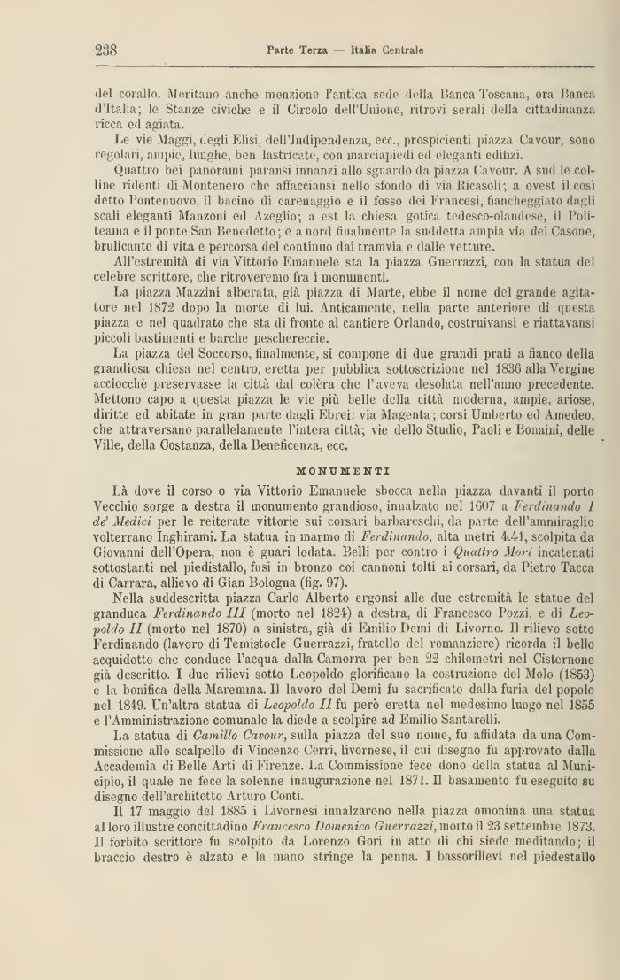 Là dove il corso o via Vittorio Emanuele sbocca nella piazza davanti il porto Vecchio sorge a destra il monumento grandioso, innalzato nel 1G07 a Ferdinando I de' Medici per le reiterate vittorie sui corsari barbareschi, da parte dell'ammiraglio volterrano Inghirami. La statua in marmo di Ferdinando, alta metri 4.41, scolpita da Giovanni dell'Opera, non è guari lodata. Belli per contro i Quattro Mori incatenati sottostanti nel piedistallo, fusi in bronzo coi cannoni tolti ai corsari, da Pietro Tacca di Carrara, allievo di Gian Bologna (fig. 97).