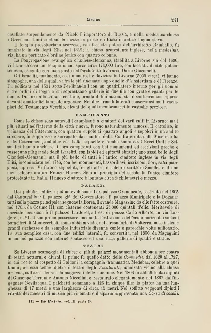 Gli Israeliti, finalmente, così numerosi e doviziosi in Livorno (5000 circa), vi hanno sinagoghe, una delle quali va fra le più rinomate dopo quelle d'Amsterdam e di Firenze. Fu edificata nel 1591 sotto Ferdinando I con uu quadrilatero interno per gli uomini e tre ordini di logge a cui soprastauno gallerie in due file con grate eleganti per le donne. Dinanzi alla tribuna centrale, ornata di fini marmi, sta il santuario con appese davanti quattordici lampade argentee. Nei due armadi laterali conservansi molti esemplari del Testamento Vecchio, alcuni dei quali membranacei in custodie preziose.