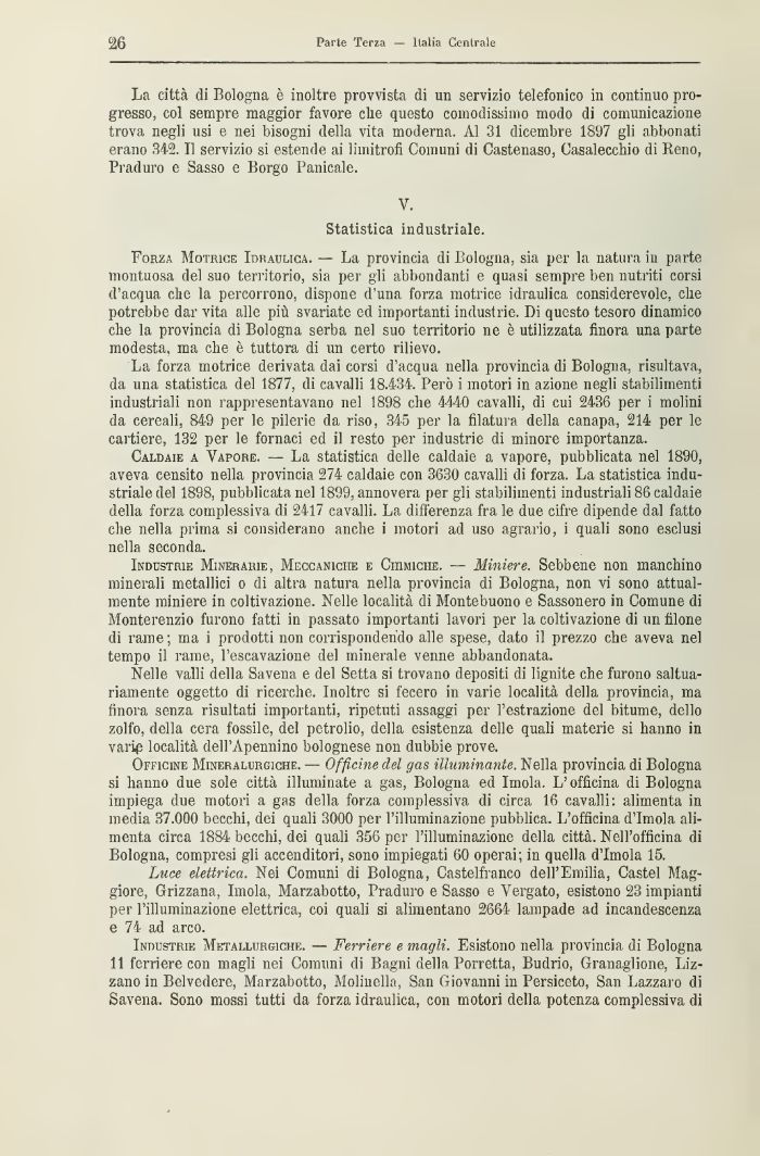 Luce elettrica. Nei Comuni di Bologna, Castelfranco dell'Emilia, Castel Maggiore, Grizzana, Imola, Marzabotto, Praduro e Sasso e Vergato, esistono 23 impianti per l'illuminazione elettrica, coi quali si alimentano 2664 lampade ad incandescenza e 74 ad arco.