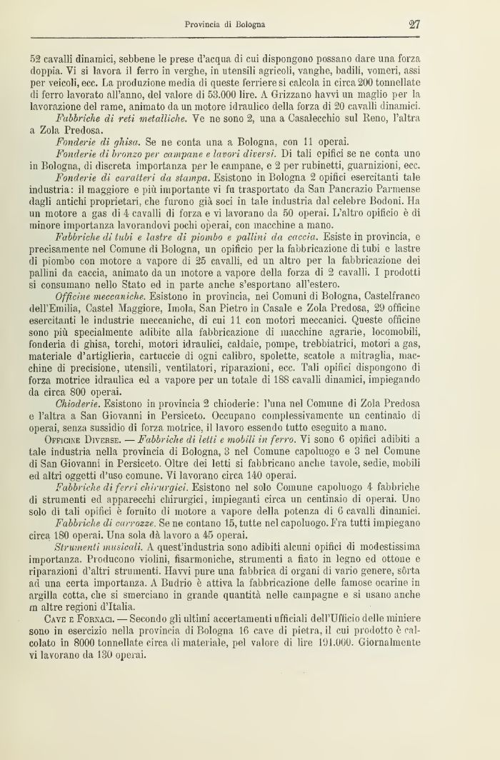 Cave e Fornaci. — Secondo gli ultimi accertamenti ufficiali dell'Ufficio delle miniere sono in esercizio nella provincia di Bologna 16 cave di pietrai il cui prodotto è calcolato in 8000 tonnellate circa di materiale, pel valore di lire 191.000. Giornalmente vi lavorano da 130 operai.