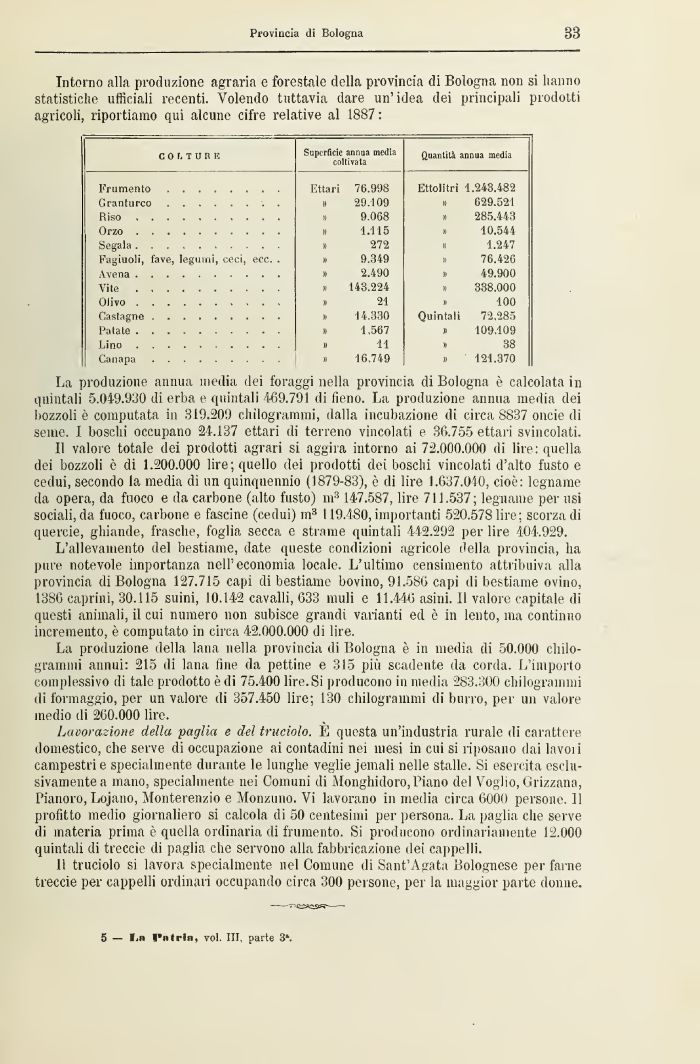 Intorno alla produzione agraria e forestale della provincia di Bologna non si hanno statistiche ufficiali recenti. Volendo tuttavia dare un'idea dei principali prodotti agricoli, riportiamo qui alcune cifre relative al 1887 :