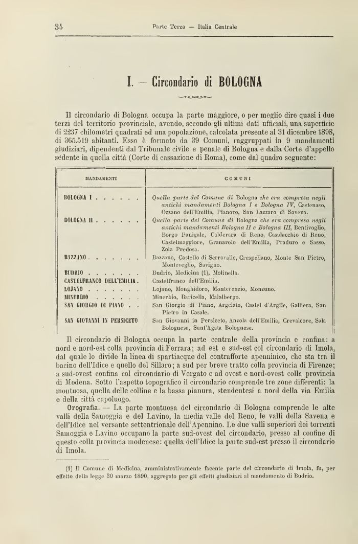 Il circondario di Bologna occupa la parte maggiore, o per meglio dire quasi i due terzi del territorio provinciale, avendo, secondo gli ultimi dati ufficiali, una superficie di 2237 chilometri quadrati od una popolazione, calcolata presente al 31 dicembre 1898, di 3G5.519 abitanti. Esso è formato da 39 Comuni, raggruppati in 9 mandamenti giudiziari, dipendenti dal Tribunale civile e penale di Bologna e dalla Corte d'appello sedente in quella città (Corte di cassazione di Roma), come dal quadro seguente: