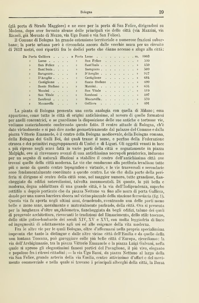 Il Comune di Bologna ha grande estensione territoriale e numerose frazioni subur-bane; la parte urbana però è circondata ancora dalle vecchie mura per un circuito di 7012 metri, così ripartiti fra le dodici porte che dànno accesso e sfogo alla città: