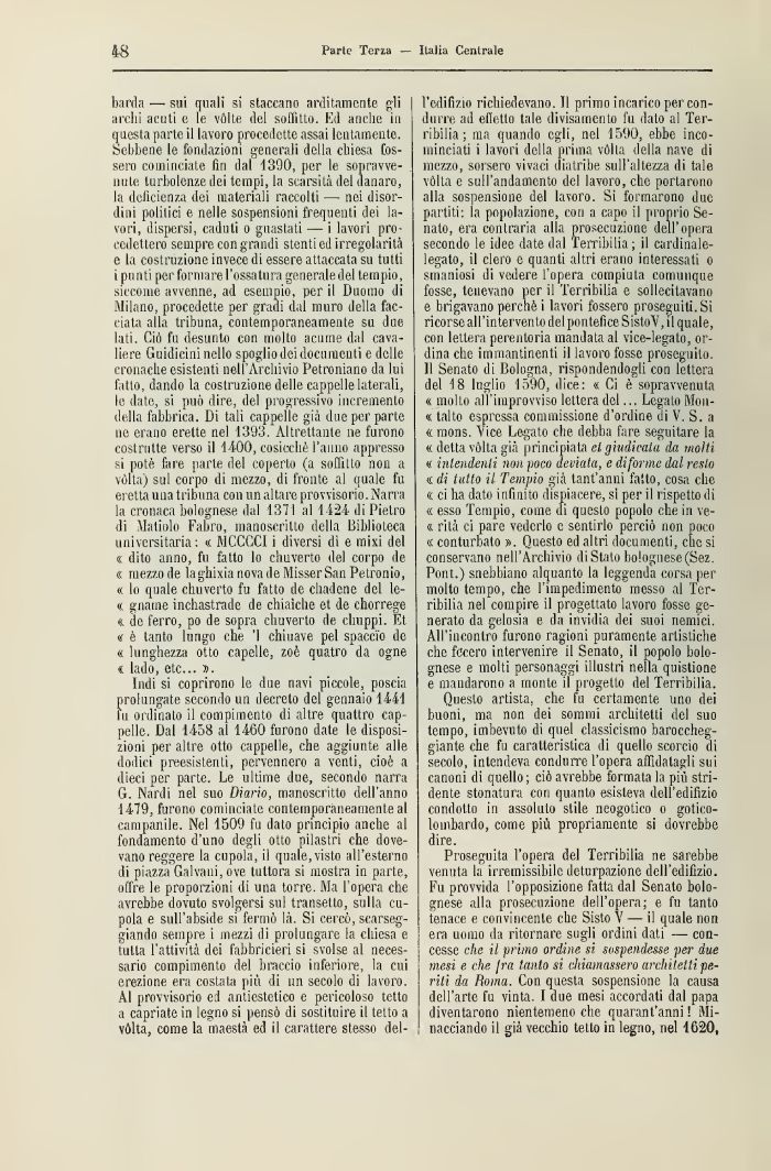 barda — sui quali si staccano arditamente gli archi acuti e le vòlte del soffitto. Ed anche in questa parte il lavoro procedette assai lentamente. Sebbene le fondazioni generali della chiesa [ossero cominciate fin dal 1390, per le sopravvenute turbolenze dei tempi, la scarsità del danaro, la deficienza dei materiali raccolti — nei disordini politici e nelle sospensioni frequenti dei lavori, dispersi, caduti o guastati — i lavori procedettero sempre con grandi stenti ed irregolarità e la costruzione invece di essere attaccata su tutti i punti per formare l'ossatura generale del tempio, siccome avvenne, ad esempio, per il Duomo di Milano, procedette per gradi dal muro della facciata alla tribuna, contemporaneamente su due lati. Ciò fu desunto con molto acume dal cavaliere Guidieini nello spoglio dei documenti e delle cronache esistenti noli 'Archivio Petroniano da lui fatto, dando la costruzione delle cappelle laterali, le date, si può dire, del progressivo incremento della fabbrica. Di tali cappelle già due per parte ne erano erette nel 1393. Altrettante ne furono costrutte verso il 1400, cosicché l'anno appresso si potè fare parte del coperto (a soffitto non a vòlta) sul corpo di mezzo, di fronte al quale fu eretta una tribuna con un altare provvisorio. Narra la cronaca bolognese dal 1371 al 1424 di Pietro di Watiolo Fabro, manoscritto della Biblioteca universitaria: « MCCGCI i diversi di e misi del « dito anno, fu fatto lo cliuverto del corpo de « mezzo de laghixia nova de Misser San Petronio, « lo quale cliuverto fu fatto de eliadenc del lete gnaine inchastrade de chialche et de cltorrege