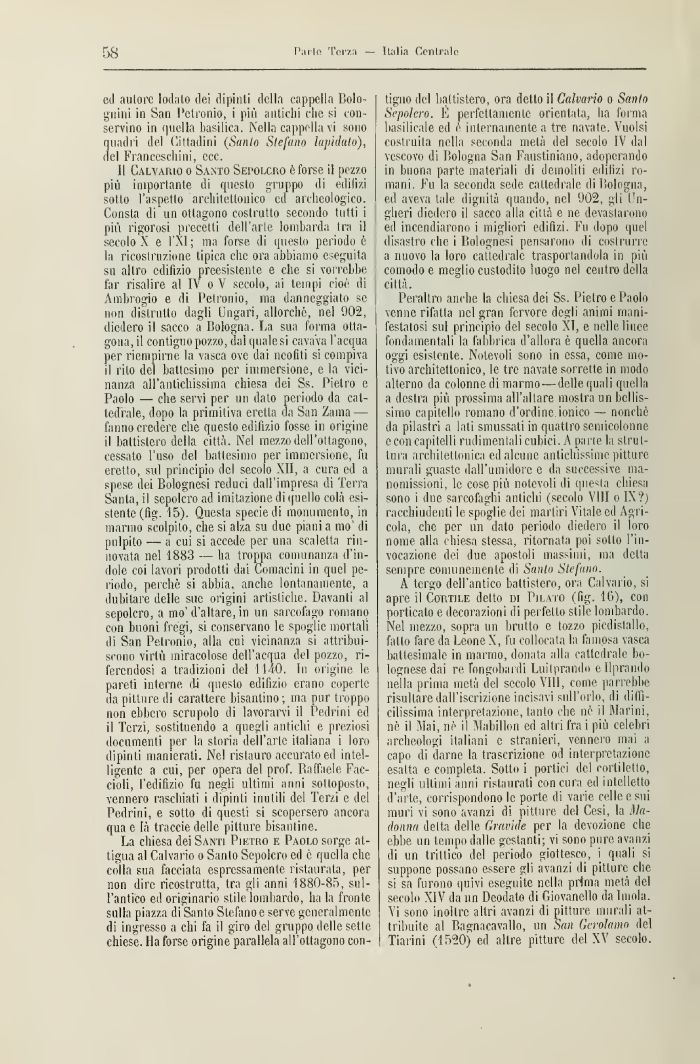 Il Calvario o Santo Sepolcro è forse il pezzo più importante di questo gruppo di edilizi sotto l'aspetto architettonico ed archeologico. Consta di un ottagono costrutto secondo tutti i più rigorosi precetti dell'arte lombarda tra il secolo X e l'XI; ma forse di questo periodo è la ricostruzione tipica che ora abbiamo eseguita su altro edilìzio preesistente e che si vorrebbe far risalire al IV o V secolo, ai tempi cioè di Ambrogio e di Petronio, ina danneggiato se non distrutto dagli Ungari, allorché, nel 902, diedero il sacco a Bologna. La sua forma ottagonali contiguo pozzo, dai quale si cavava l'acqua per riempirne la vasca ove dai neofiti si compiva il rito del battesimo per immersione, e la vicinanza all'antichissima chiesa dei Ss. Pietro e Paolo — che servi per un dato periodo da cattedrale, dopo la primitiva eretta da San Zaina — fanno credere che questo edilizio fosse in origine il battistero della città. Nel mezzo dell'ottagono, cessato l'uso del battesimo per immersione, fu eretto, sul principio del secolo XII, a cura ed a spese dei Bolognesi reduci dall'impresa di Terra Santa, il sepolcro ad imitazione di quello colà esistente (fig. 15). Questa specie di monumento, in marmo scolpito, che si alza su due piani a mo' di pulpito — a cui si accede per una scaletta rinnovata nel 1883 — ha troppa comunanza d'indole coi lavori prodotti dai Coniacini in quel periodo, perchè si abbia, anche lontanamente, a dubitare delle sue origini artistiche. Davanti al sepolcro, a mo'd'altare, in un sarcofago romano con buoni frégi, si conservano le spoglie mortali di San Petronio, alla cui vicinanza si attribuiscono virtù miracolose dell'acqua del pozzo, riferendosi a tradizioni del 1140. In origine le pareti interne di questo edilìzio erano coperte da pitture di carattere bisantino; ma pur troppo non ebbero scrupolo di lavorarvi il Pedrini ed il Terzi, sostituendo a quegli antichi e preziosi documenti per la storia dell'arte italiana i loro dipinti manierati. Nel ristauro accurato ed intelligente a cui, per opera del prof. Raffaele Fac-cioli, l'edilizio fu negli ultimi anni sottoposto, vennero raschiati i dipinti inutili del Terzi e del Pedrini, e sotto di questi si scopersero ancora qua e là traccie delle pitture bisantine.