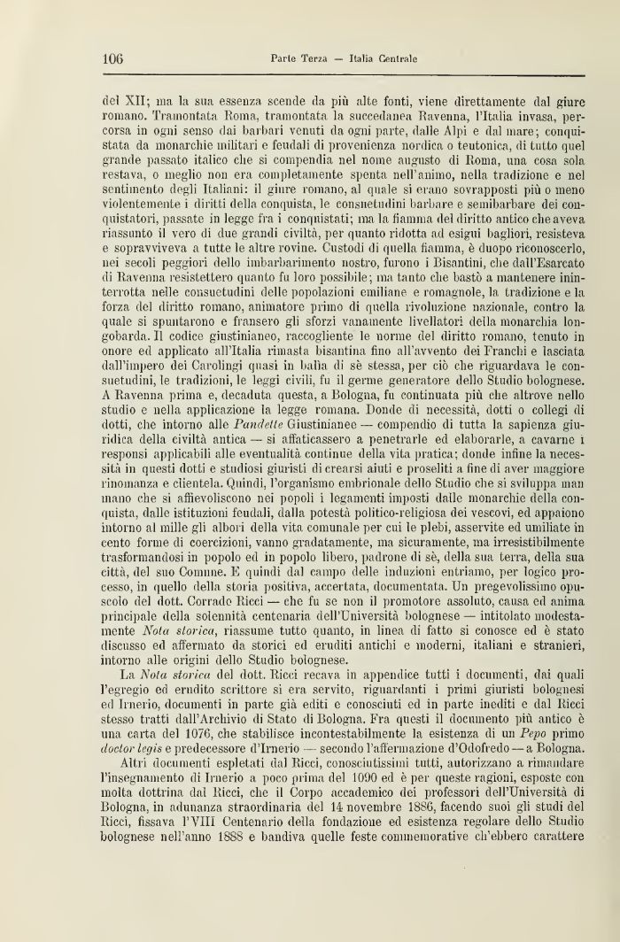 Altri documenti espletati dal Ricci, conosciutissimi tutti, autorizzano a rimandare l'insegnamento di Irnerio a poco prima del 1090 ed è per queste ragioni, esposte con molta dottrina dal Ricci, che il Corpo accademico dei professori dell'Università di Bologna, in adunanza straordinaria del 14 novembre 1886, facendo suoi gli studi del Ricci, fissava l'Vili Centenario della fondazione ed esistenza regolare dello Studio bolognese nell'anno 1888 e bandiva quelle feste commemorative ch'ebbero carattere