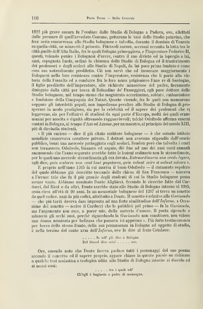 E pròpri! nell'anno 12(35 in cui moriva il buon Odofredo — il ristaurato sepolcro del quale abbiamo già descritto toccando della chiesa di San Francesco — nasceva a Firenze tale che fu il più grande degli studenti (li cui lo Studio bolognese possa menar vanto. Abbiamo nominato Dante Alighieri. Secondo le ricerche fatte dal Carducci, dal Pucci e da altri, Dante sarebbe stato allo Studio di Bologna intorno al 1285, ossia circa all'età di 20 anni. In un memoriale bolognese del 1287 si trova un sonetto da quél codice, anzi da più codici, attribuito a Dante. 11 sonetto è relativo alla Garisenda — che più tardi doveva dare impronta ad una forte similitudine dell'Inferno. < Occasione del sonetto — scrive il Carducci che lo pubblicò pel primo — fu la Garisenda, ma l'argomento non esce, a parer mio, dalla materia d'amore. 11 poeta riprende e minaccia gli occhi suoi, perchè riguardando la Garisenda non conobbero, non videro una donna nominata per bellezza che passava ivi appresso ». Più forte testimonianza per bocca dello stesso Dante, della sua permanenza in Bologna ad oggetto di studio, è nella terzina del canto xvm dell'Inferno, ove fa dire al frate Catalano:
