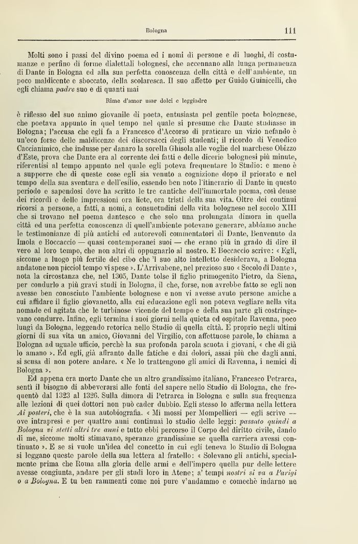 Molti sono i passi del divino poema ed 1 nomi di persone e di luoghi, di costumanze e perfino di forme dialettali bolognesi, che accennano alla lunga permanenza di Dante in Bologna ed alla sua perfetta conoscenza della città e dell' ambiente, un poco maldicente e sboccato, della scolaresca. Il suo afletto per Guido Guinicelli, che egli chiama padre suo e di quanti mai